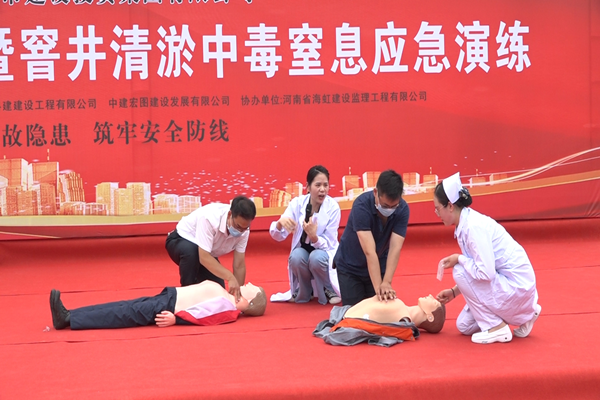 市政建设管理中心在杏贾路市政道路施工现场开展一次窨井中毒窒息应急救援演练活动,参加人员共计100余人,涉及公司所有在建市政工程项目参建单位。演练模拟污水井清淤作业意外中毒为背景展开,并邀请郑大一附院两名专家进行急救知识讲解和心肺复苏教学,取得了非常好的效果